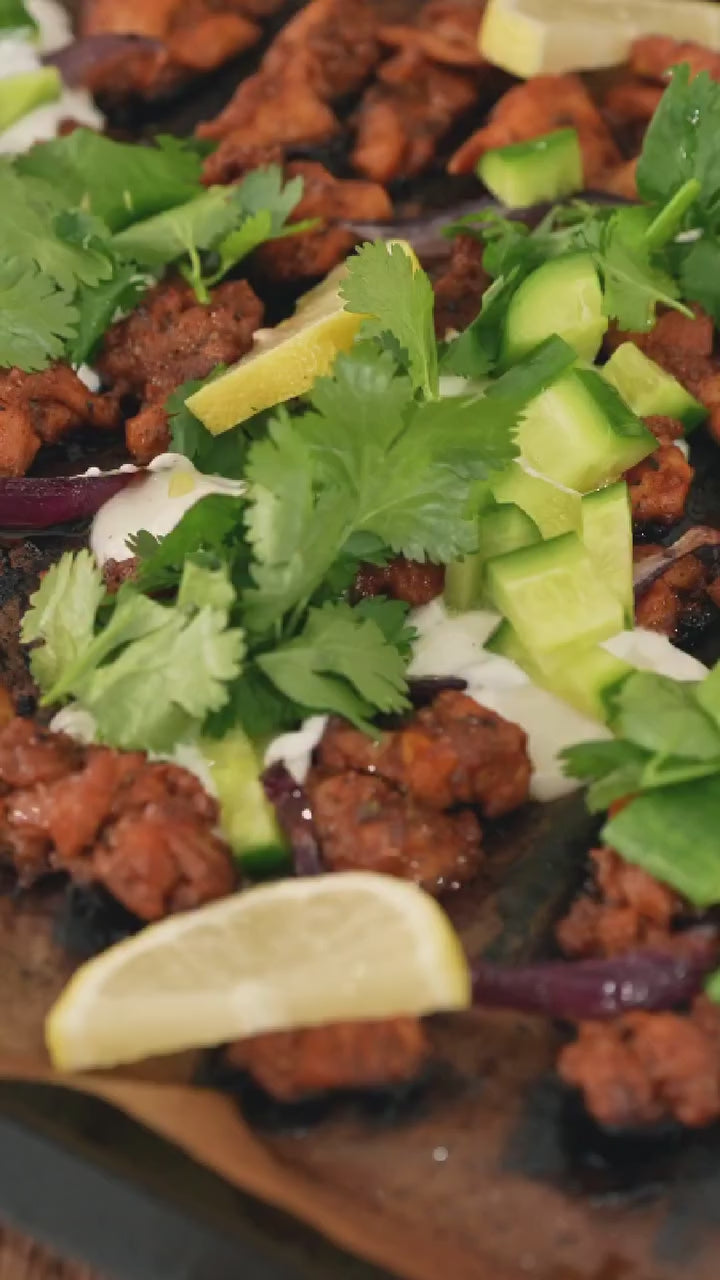 Spoon the yogurt sauce over the chicken, add diced cucumber and fresh coriander, and enjoy your shawarma-style dinner straight from the pan.
