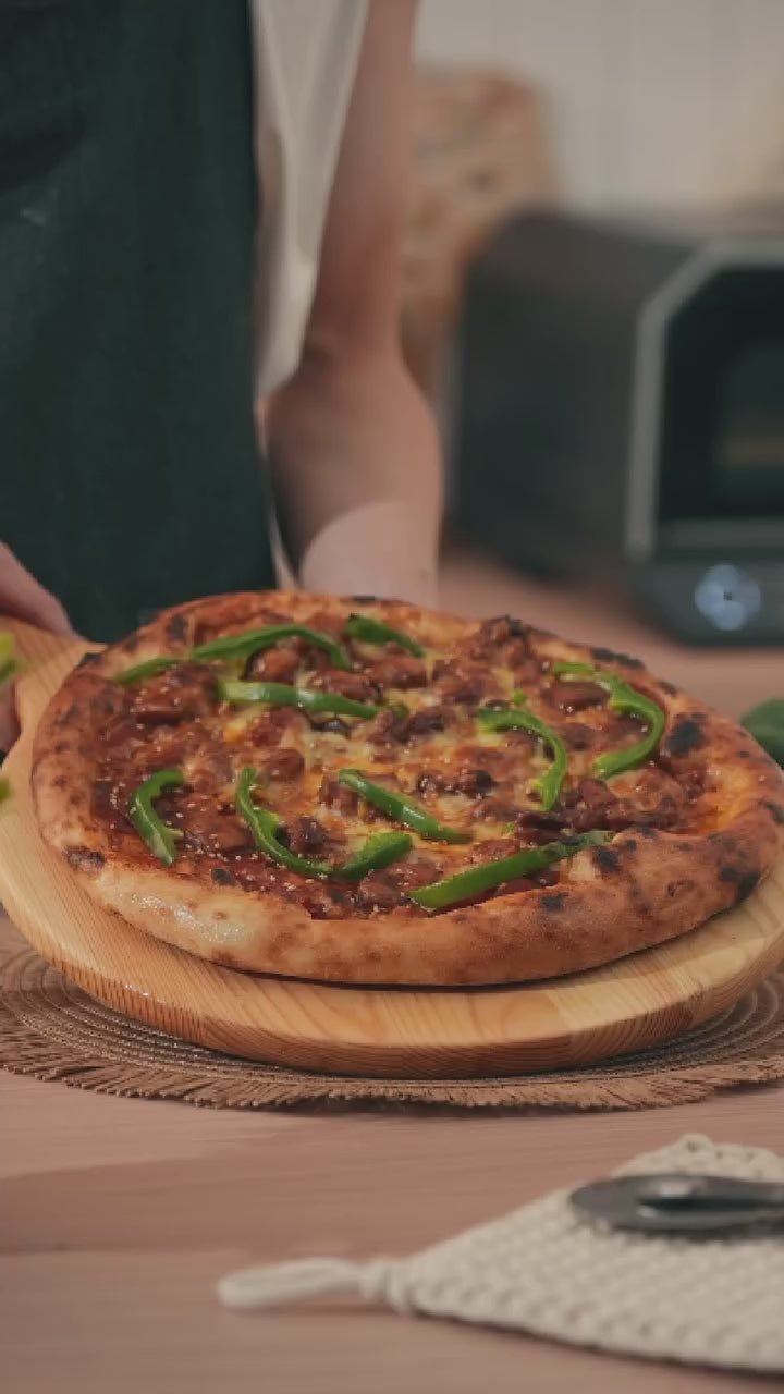 Add mozzarella → spicy chicken → green pepper → more mozzarella on top.
