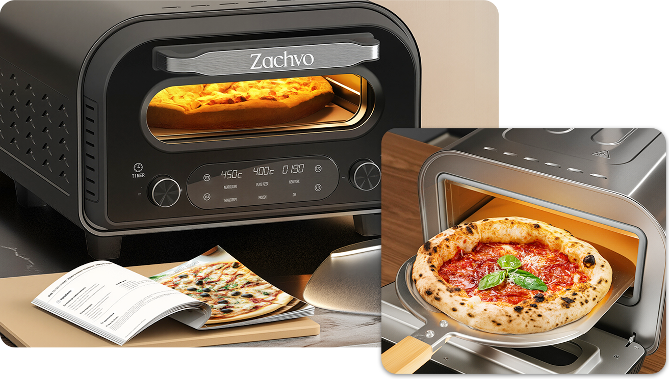 Ihr persönlicher Pizzameister für zu Hause – mit zwei Heizelementen und sechs voreingestellten Backmodi für eine Vielzahl von Pizzen. Genießen Sie perfekt gebackene Pizza in nur wenigen Minuten.
